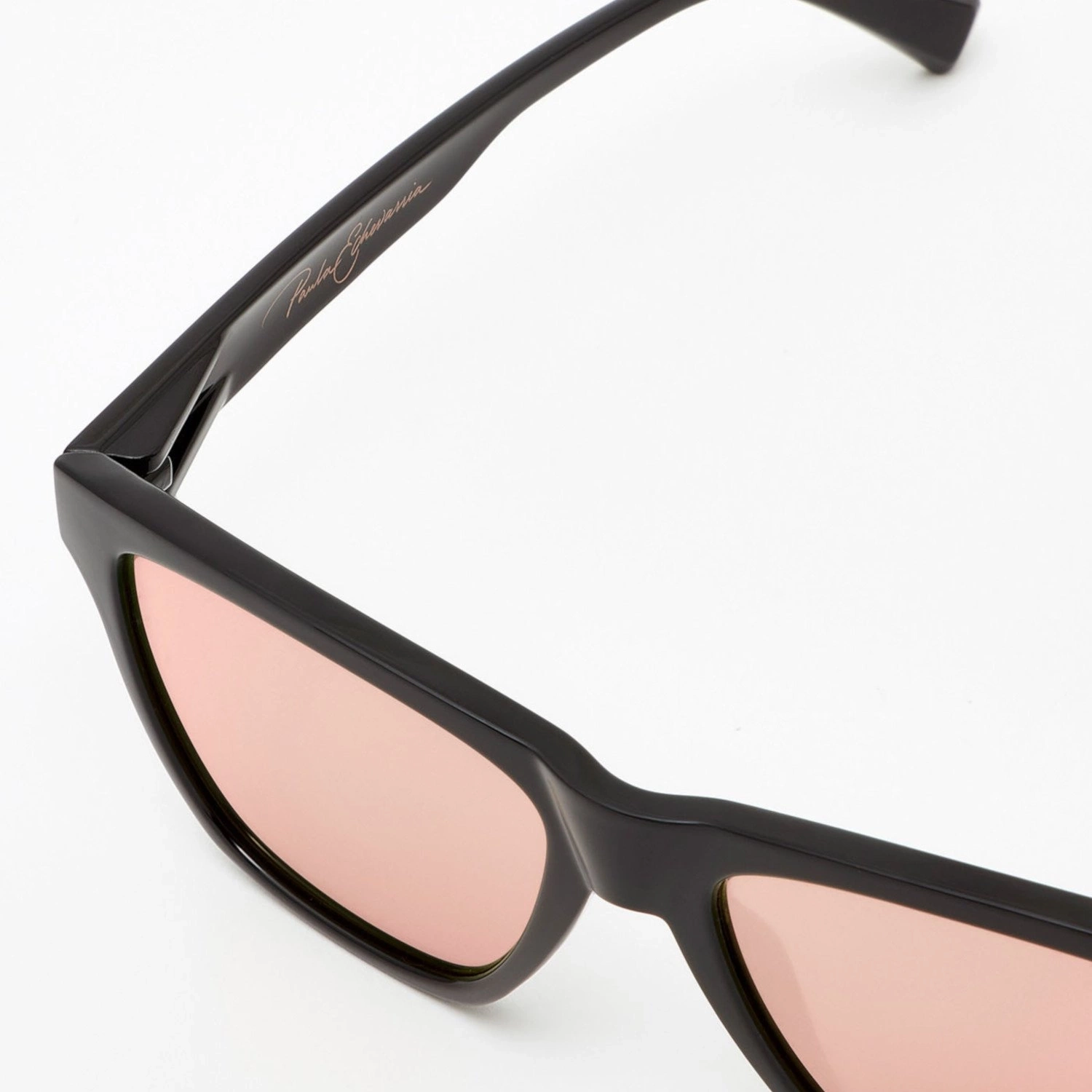Błyszcząca czarna rama z różowymi, lustrzanymi soczewkami.
